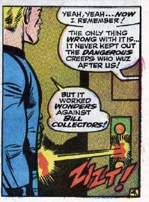 Back to the fight. Reed and the Wizard – who’s still calling himself the “Wingless Wizard,” amusingly – throw each other around the room for a while. Then there’s a strange run of a few pages where, for some reason, Ben still believes he has all the strength he has as the Thing. He can’t punch very hard, he can’t lift heavy objects, etc. The Wizard delights in this, kicking Ben around like a schoolyard bully. Reed rescues Ben from being thrown against a wall, knocking himself out in the process. Johnny rejoins the fight, trapping the Wizard inside Reed’s high-tech centrifuge device, spinning the Wizard around like crazy.