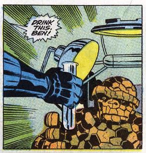 Elsewhere, the Wizard tries on a new pair of gloves he’s invented, which give him superhuman strength, capable of smashing an anvil. He believes that this, along with his usual anti-gravity devices, will be enough to destroy the FF. Back in Reed’s lab – the “chem room” to be specific – Reed hands Ben a test tube full of strange liquid. Ben drinks, and passes out (we’ve all been there, dude). His body then releases all of its cosmic energy, and one swarm of Kirby dots later, he’s human again.