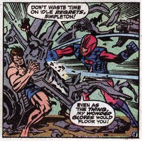 Ben just barely has enough time to wonder if the change will be permanent this time, when the Wizard attacks. We don’t know how he got inside the building, but there he is. I guess it’s safe to assume he used his gadgets and his genius. Turns out his gloves provide not just strength, but other weapons as well. He laser blasts Ben and catches Johnny in a wind-based “typhoon sphere.”