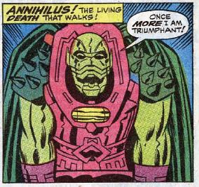 Inside the Negative Zone, a bunch of aliens are on the run from a big blue ship, which kills them all and destroys their world. A hatch opens on the ship, and out comes Annihilus, introduced in one caption as “He who annihilates,” and in another as “The living death that walks!” Why is Annihilus destroying planets? He states in a villain speech that by destroying life he is reborn.