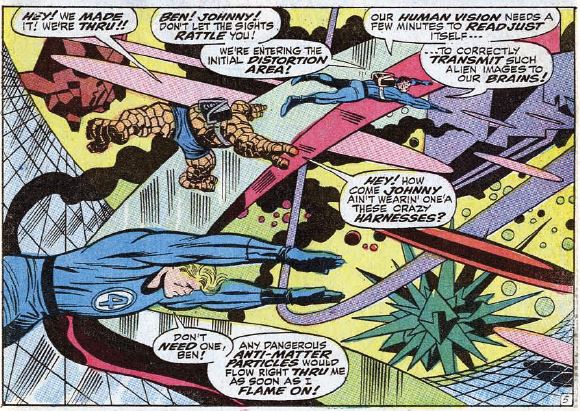 Flame on: Johnny doesn’t get as much action, and he’s on the verge of giving up as they’re being drawn toward the anti-matter planet, resigned to the fact that he’s about to die. Don’t be a quitter, Johnny.