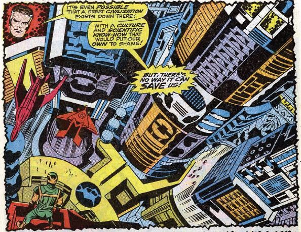 Ben and Johnny search for Reed, only to become trapped in a big globe and dragged underground, where they come face-to-face with Annihilus. He claims they are his specimens. He further explains that his cosmic control rod – the gold thing on his neck – grants him immortality, and that the only way to keep the rod is to ruthlessly slaughter anyone who might steal it from him before they get the chance. Reed is there, too, in a cage with a bunch of aliens. He somehow knows that the cosmic control rod is exactly what he needs to save Sue’s life. With a single blast, Annihilus kills all the aliens except for Reed, and locks Reed in another cage with Johnny and Ben. He’s spared the FF for his own amusement, and to learn how their powers work before he kills them. There’s several pages of fighting as Annihilus tests the FF’s powers with various death traps. Ben breaks out of the cage and knocks out Annihilus, after which Reed helps himself to the control rod. Similarly, our heroes then hotwire Annihilus’s rail-plane, using the vehicle to escape to the surface.