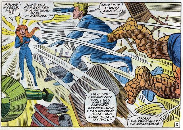 We begin with a splash page of Crystal wearing a blue FF uniform, rather than usual yellow costume. She says now that Sue is home with the baby, someone has to take her place on the team. Then we get this issue’s variation of the “excuse for the character to show off their powers in the first few pages” thing, except this time it’s Crystal showing off her powers. Nonetheless, her power set remains frustratingly ambiguous. She throws Ben and Johnny around the room with a gust of wind, saying she can “harness natural forces” and bend them to her will.