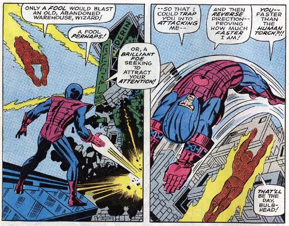 Flame on: Johnny is awfully eager to fight the Wizard. Remember, though, that the Wizard was Johnny’s arch-nemesis during his solo stories in Strange Tales, so there’s a lot of history there.