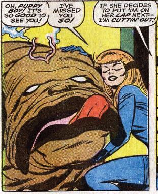 The start issue #82 tries to shock us by Crystal announcing that she’s leaving the team. But no, she’s not leaving-leaving, she says she needs her family’s permission for to be a member of the FF. Her family, remember, is the Inhumans’ royal family. She summons the Inhumans’ giant teleporting dog Lockjaw, to transport them all to the Inhumans. But wait, a bunch of Alpha Primitives are here as well, jumping through Lockjaw’s “Interdimensional screen.” The Alpha Primitives are the Inhumans’ “drone race” and they attack for seemingly no reason. The FF fight back, but not before the Alpha Primitives grab hold of Crystal. They and Lockjaw disappear with her. Reed says he’ll prepare the FF’s rocket to travel to the Inhumans’ city and find out what’s going on.