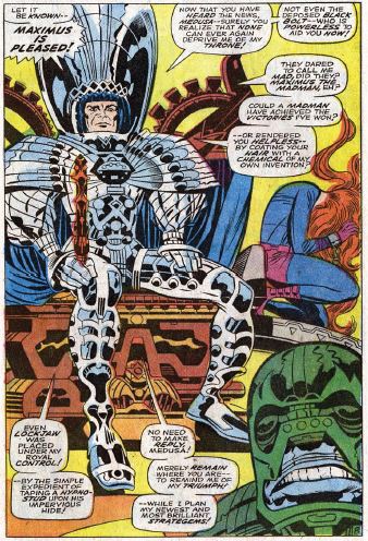 Maximus watches the fight on a viewscreen and of course he gloats about how great he is. Karnak, whose power is to find the weakness in any surface, can’t find one in the cage, saying it’s not glass, but that it’s made out of a substance he’s never seen before. Crystal tries to use her powers on Maximus, but he’s protected by a “sub-ionic” force field. Maximus then reveals his plan – he has a huge “hypno-gun” which is powerful enough to blanket the entire planet in hypno-rays, bringing the whole world under his control. And that’s the cliffhanger.