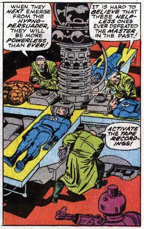 The FF have lunch at a sidewalk café, noticing that although the people look happy, there’s an underlying fear and paranoia to them. The sedative in the food knocks them out, and Doom’s henchmen hook them up to the hypno-persuader, which mentally blocks their powers as they sleep. Reed fights back and is almost able to resist, thanks to his love for Sue.