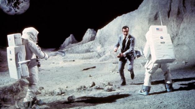 Bond bash-ups: There’s a great down-and-dirty fistfight in an elevator. The fake moon set inside the baddies’ HQ leads to a chase in which Bond makes his escape across the Nevada desert in a moon rover, pursued by guys on three-wheelers. It’s awesome in its silliness. This leads straight into a nighttime car chase down the Vegas strip, with tons of amazing practical stunts. The big finale takes place on an oil platform, another massive set piece with explosions and fights galore.