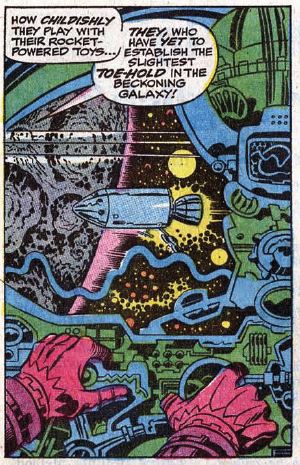 Then, somewhat randomly, we cut to outer space, for another trippy Kirby photo-page. An alien spacecraft observes an Earth rocket en route to the moon, but the aliens dismiss this historic event as Earthlings playing with toys. Then comes the reveal — it’s the Skrulls! More specifically, it’s a Skrull who calls himself “The Slaver.” He says that even though Earth is off-limits to Skrulls, he’s breaking those rules in the hopes of finding and capturing one very important human.
