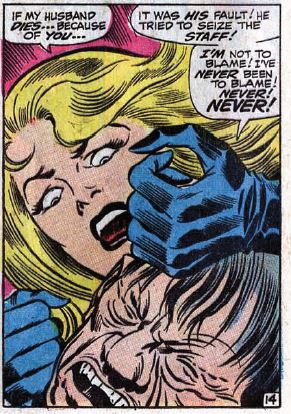 Sue flips out, attacking the Mole Man, as he has a total guilt trip, saying “I’m never to blame! Never! Never!” The staff is destroyed, which restores everyone’s sight. (Science?) There’s an incredibly badass splash page of Johnny flying to attack the Mole Man, before the Mole Man can summon his subterraneans. Defeated, the Mole Man collapses, reciting his origin, how mankind drove him underground as an outcast. Johnny sees through the B.S., saying that the Mole Man chose to go underground, and that no one forced him. Meanwhile, Ben performs artificial respiration on Reed, bringing him back to life. Sorry, slash-ficcers, but we don’t actually get to see their lips touch. Ben has a great moment when he reveals that for as much crap as he gives Reed, he thinks Reed is “the greatest.”