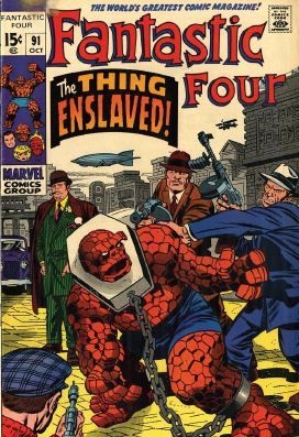 Re-reading the Fantastic Four comics from the start. The end of the last issue had the Thing being captured by a Skrull and carried off into space. So why are there 1930s-style gangsters on the cover to issue #91? Let’s see…