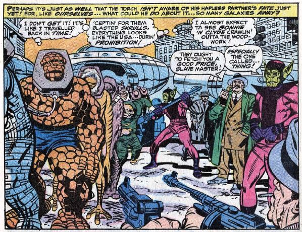 On the Skrull planet, Ben arrives with the Slave-Master and a bunch of other alien slaves. Ben is surprised to learn the planet looks just like New York during the age of prohibition. A bunch of punk kids throw a brick at Ben, he makes the obligatory reference to the Yancy Street Gang, and tries to fight back. More nerve rays from the Skrulls shut him up pretty good. There’s a confusing bit of business where Boss Barker pays his ten power stones as a “down payment” for Ben, with arguing over whether it’s actually ten stones or not. Whatever. He leaves with Ben.