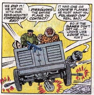 As the aliens/gangsters drive Ben through the streets, we get the backstory. On Earth in the 1930s, a crook named Machine Gun Martin escaped from jail. In his fleeing from cops, he came across a Skrull slave ship, who brought him to Kral. Through him, and then through old gangster movies, the Skrulls of Kral decided to base their entire society on old-timey Earth gangster culture. The exposition is interrupted by an attack from a biplane, equipped with alien superweapons, which tears up the road in front of the car. The Skrulls/gangsters flip a switch, allowing it to fly, and to fight back with its own superweapons.