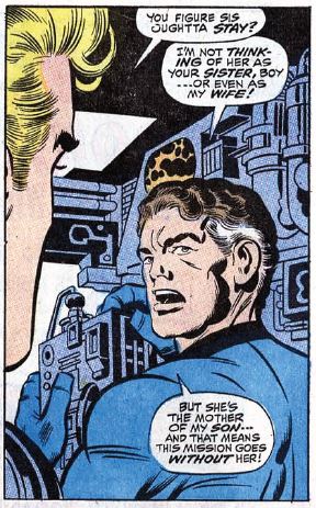 Back on Earth, Johnny and Crystal conclude that Ben is not in New York and that Reed was right about suspecting the Skrulls. Inside HQ, Reed is modifying the Skrull flying saucer, which the team took ownership of way back in issue #2. (!) Sue wants to join the team as they head into space, but Reed insists she stay behind to take care of the baby.