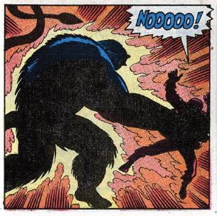 It looks like the fighting is over, but Harkness appears at the top of the stairs. Ebony transforms from an ordinary cat into a giant panther. There’s a strange bit where Ebony chases the Wizard out of a window, and as the Wizard flies off into the sky, Ebony’s face fills the entre sky around him. (Magic, I guess?) Sandman tries to attack Harkness, but she transforms him into hard, solid rock. The Trapster runs for it, but a big demonic monster blocks the exit, and Trapster faints with fear.