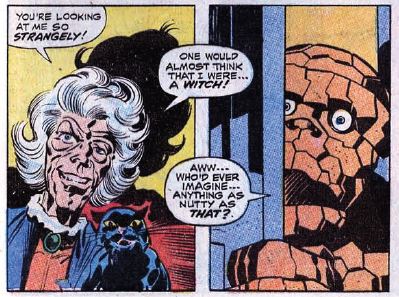 We turn the page, and the “demonic monster” was really Ben, who didn’t even lay a hand on the Trapster. The sand, anti-grav disc, and paste have all disintegrated. Medusa is freed as well. They find Sandman and Wizard both paralyzed with fear. Reed and Sue are out of their room, and everyone rushes to Harkness’s room, where the baby is. They find everything is OK — the baby is sleeping and Harkness is sitting there, knitting. Ben sees a book in the room titled “Tales of Old Salem,” and he suspects that Harkness is a witch. She voices his suspicion before he can say it, suggesting that she read his mind, so Ben freaks out and runs out of the room, Scooby-Doo style.