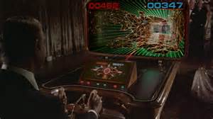 Bond baggage: Bond first meets Largo at… the video arcade! Not just any arcade, but a really fancy one inside a casino, where there are no kids, but adults in their finest evening wear dumping quarters into Centipede or Galaga. Bond and Largo get in one the fun playing a 3-D “world domination” video game that gives electric shocks to the loser.