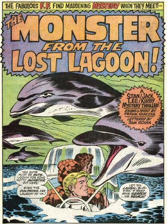 We begin in the middle of the story, with Reed, Ben and Johnny in the ocean in their mini-sub, dolphins swimming all around them. (See, I can’t really say Kirby was phoning it in, because those dolphins look great.) Reed explains that there have been a lot of ships disappearing in the Lost Lagoon, and the U.S. Navy has asked the FF to investigate. (How is the “lagoon” in middle of ocean?)
