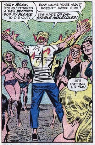Flame on: Johnny’s so torn up over Crystal’s absence that he turns away a whole group of bathing beauties on the beach. He does stop long enough to remind them (and us) that his clothes don’t catch fire because they’re made of unstable molecules.