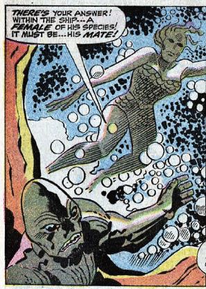 Now in an underground cave, with air, Ben confronts the monster. Then, fighting! The monster is strong and fast, a good match for Ben. Johnny and Reed recover from almost drowning and join the battle. The monster runs off deeper into the caves, and our heroes pursue. There, they find him with a strange craft that looks like a big piece of coral. Reed, always the genius, immediately deduces that the monster is from another planet, one that is water-based. He’s carrying big globes of water into the ship, where he has a hot mermaid-type girlfriend inside. The monster coincidentally finishes his repairs at just that moment, and he takes off back to his homeworld. Just like that, the issue ends.