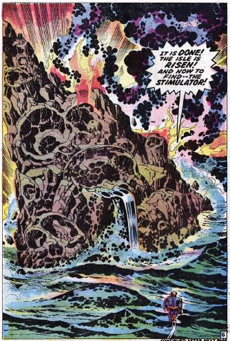 At FF headquarters, Reed, Johnny and Ben blast off in a rocket lent to them by NASA. Reed says they’re not trying to race the astronauts to the moon, just seeing to it that the astronauts get there safely. They fly straight to the island, and there’s some action where Johnny burns a runway into the ground before the rocket can crash. They investigate the island, finding it to be an exact replica of the surface of the moon.