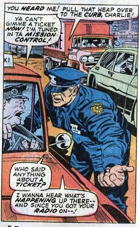 Meanwhile, the NASA rocket takes off from Cape Canaveral, and there are a few fun panels where ordinary folks around the world are all tuned in to watch. Back on the island, the sentry has found his stimulator, a big alien radar-type thingie, but he is distracted by the FF’s arrival. And… fighting! Johnny is no match for the sentry, but Reed does a sweet move where he grabs the sentry and throws him at Ben, who promptly knocks him out. Yay, teamwork.