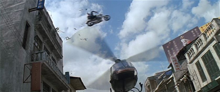 Bond bash-ups: This has got to be the fastest-paced Bond film, the fighting and chases just don’t let up the whole time. We’ve got an opening with Bond escaping an illegal arms conference in a jet, a fistfight behind the scenes at Carver’s show, and an elaborate shootout in Carver’s secret lab. This leads to the movie’s most famous scene, in which Bond pilots his remote control car around a parking garage, with him in the back seat. When the action moves to Saigon, we get a harrowing skydive turned deep sea dive, lots of martial arts fighting, and a wild helicopter-versus-motorcycle chase. The finale is, as always, gunfights and pyrotechnics galore aboard the secret ship.
