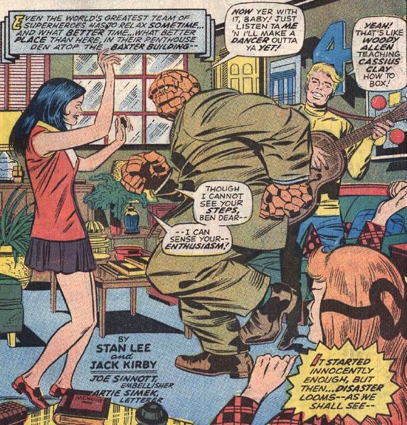 We open with some sitcom shtick at the Baxter Building, as our heroes are throwing a dance party. Alicia is there, with long black hair now. Ben trips while dancing and smashes up some furniture. (How much of the FF’s furniture do you suppose he’s inadvertently destroyed by this point?) The fun is interrupted when a letter arrives from a group called the “Maggia.” They claim to have purchased the Baxter Building, and they’re evicting the FF!