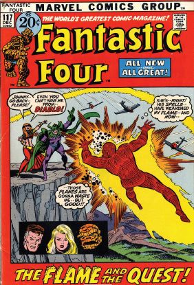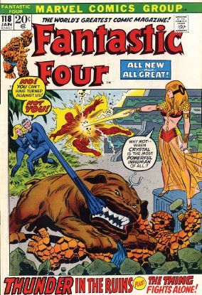 Issue #117: We begin with Johnny, who has been all ticked off at everyone for the last few issues, flying to the Inhumans’ secret city in the Himalayas, in hopes of reuniting with Crystal. Crystal, remember, left abruptly several issues ago saying she could no longer live among human pollution. Johnny fights a bunch of Inhumans standing guard out in the snow, who reveal that Crystal never arrived at the city, and everyone believes she’s still with the FF. Also, Maximus the Mad has, through circumstances never revealed, taken over the city. Johnny, weakened from the fight, catches up with the rest of the FF at Agatha Harkness’s house. Harkness uses her (what else?) crystal ball to find Crystal, only to report that Crystal is no longer in “the normal world.”