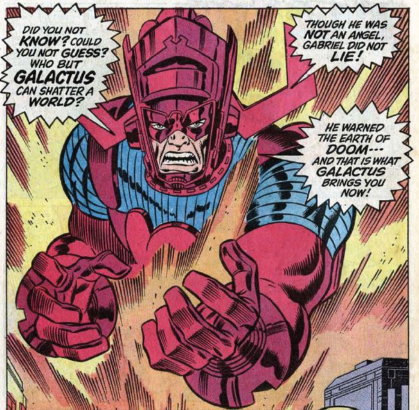 In outer space just beyond Earth, the Silver Surfer takes notice of the battle, and he flies down to join the FF. The Surfer and Gabriel fight, while spouting a lot of serious dialogue about truth and destiny. The Surfer finally destroys Gabriel, revealing him to be a highly powerful robot. Just as our heroes ask who could have built such a robot, the answer appears in the sky above them — it’s Galactus, and he looks pissed!