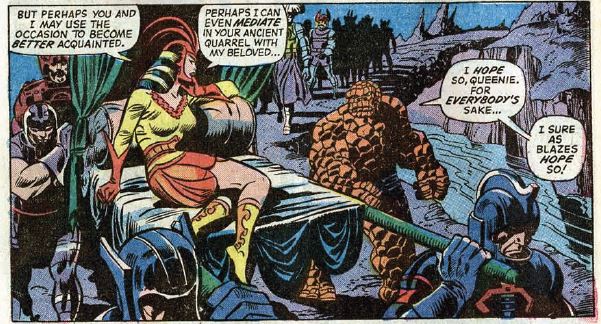 Underground, Ben hears a woman singing, and rescues her from a monster. She is Kala, who says she is both an Atlantean, and queen of the “Netherworld,” which was separated from Atlantis years ago in an earthquake. She too is searching for the Mole Man, who she says is her “betrothed.” Reed, Sue, and Johnny enter the underground amid much bickering. Ben fights a bunch of Subterraneans and gets captured by the Mole Man. The whole thing was a trap by him and Kala. The Mole Man explains at great length his plans to cover the surface world with deadly lava. Ben escapes and fights more Subterraneans, only for the Mole Man to reveal that he hit Ben with an electrical aura, making him look like a big hairy monster. The FF see him, and, assuming he’s a beast, they attack.