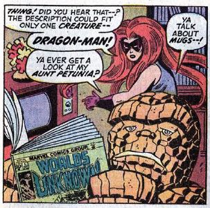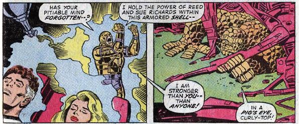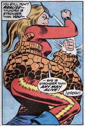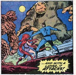 The big day comes and the stadium is filled with spectators, and there’s even a referee monitoring the fight. Who’s organizing all this? Thundra knocks Ben out of the stadium’s ruining the Frightful Four’s plans to blow it — and her — up. Ben and Thundra fight atop New York’s World Globe statue. Just when it looks like Thundra has won, Reed uses a device that temporarily turns Ben back into a human. Thundra says she refuses to fight a weakling, so she leaves. Ben turns back into the Thing, saying, “Guess you can never figger a dame!” The three remaining members of the Frightful Four swear revenge on both Thundra and the FF.