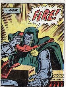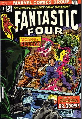 Issue #144: Reed, Medusa, Ben, and misunderstood monster Darkoth approach Dr. Doom’s secret hideout in the NYC sewers, hoping to stop Doom before he unleashes a “vibration bomb” that will rewrite all human brains to make them perfectly loyal to him. (Got all that?) They’re attacked by a green-skinned monster called the Seeker, which Reed immediately deduces is one of Doom’s androids. They knock out the Seeker and take him back to the Baxter Building. Only it seems that they’re too late, because Doom launches the bomb into the atmosphere. Check out Doom’s cell phone: