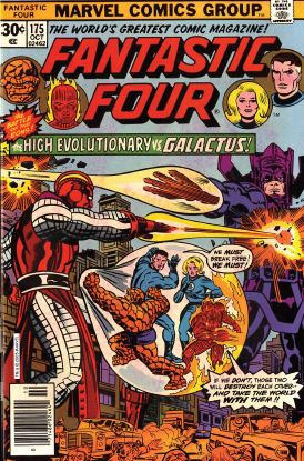Issue #175: Galactus and the High Evolutionary (who is now several stories tall — I guess he has growth powers) confront each other in the skies over Counter-Earth. The H.E. puts up a good fight, but is knocked out by Galactus. Galactus starts building his world-devouring machine (the one we all remember from issues #49-51) when the reunited FF appear and fight him. Then Sue arrives with a message for Galactus from another world. This world is offering itself to Galactus in place of one full of innocent lives.
