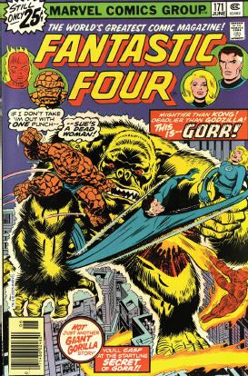 Issue #171: To recap, Ben is human again, but still fights the bad guys by wearing a super-strong Thing suit that Reed invented. There are several pages of excuse-for-the-characters-to-use-their-powers inside the FF’s new danger room. Johnny, meanwhile, is still dating Frankie Raye. He says he’s leaving the FF for her, because she gets freaked out around superhero types. Then, a strange craft lands nearby and a giant golden gorilla (!) comes out of it. Johnny wants to fly off and fight it, but decides to stay with Frankie and let the cops handle the monster.