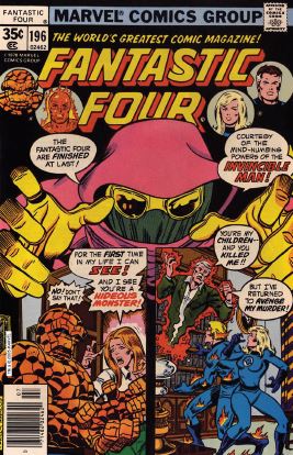Issue #196: Reed has started his new job, working on a top-secret science experiment. At night, he has nightmares about killing his former teammates. Turns out that while Reed sleeps, he’s being monitored by a Dr. Hauptmann. (Longtime readers might remember that name.) In Hollywood, Ben and Johnny pay Sue and Franklin a visit. Sue says she’s worried because she hasn’t heard from Reed. They’re secretly being watched by a masked man outside their window.