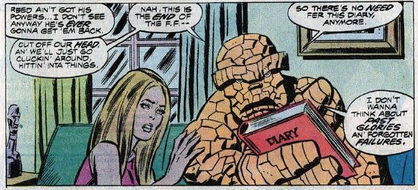Ben and Alicia have an issue-long heart-to-heart where he reads from his diary (!) so we get an entire issue of flashbacks to previous FF adventures. It’s like a “clip show” but with all-new art. Ben destroys the diary at the end, saying he’s never going back to the FF.