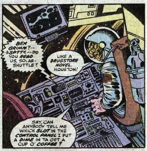 Issue #193: Ben has offered his “services” to NASA. He’s there when the place is attacked by Darkoth the Death-Demon. (Darkoth, remember, was a guy experimented on and turned into a monster by Dr. Doom.) Darkoth and Ben fight, only for Darkoth to escape. Ben is there to test fly NASA’s new “Solar Shuttle.” That night, he gets an anonymous phone call saying the shuttle has been sabotaged.