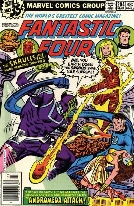 Issue #206: Dorrek gloats about having captured the FF, and he plans to put them on trial in front of the entire Skrull empire, in the center of huge arena. Reed and Ben are shot, and Sue fears they are dead. While the Skrulls continue their attack on Xandar, Xandar’s leader, Thoran Prime, communes with the computer, which transforms him somehow.