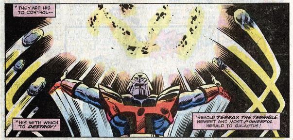 Galactus gives Tyros the power cosmic, transforming him into his new herald and renaming him Terrax. Galactus threatens to turn Terrax into a worm if he does not obey, and Terrax swears loyalty to his new boss. Galactus then says it’s time to save the Earth from the Sphinx, so he can devour the Earth himself.