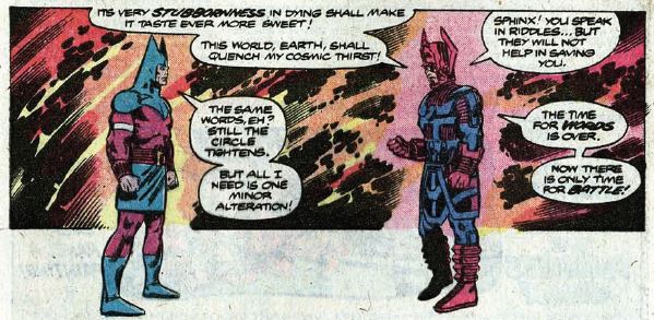 Galactus shows up and confronts the Sphinx. (Galactus actually says, “Sphinx! You speak in riddles.”) On board Galactus’ ship, Reed tinkers with some machines when Terrax returns, threatening to destroy the FF.