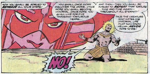 Issue #212: After three pages of recaps, Terrax arrives on Earth and fights the FF for a bit. The aging ray knocks Sue unconscious, and Reed, now wrinkly and grey-haired himself, puts her in suspended animation in the Baxter Building. Terrax and H.E.R.B.I.E. search for the Sphinx, who has created a “disturbance” to hide from Galactus. The Sphinx has returned to Egypt, where he flashes back to his origin, and how he gained his magic powers and his immortality. He uses his godlike powers to recreate ancient Egypt in all its former glory.
