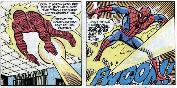 Issue #207: While Reed, Sue, and Ben are in space caught in a war between the Skrulls and the Xandarians, Johnny has gone back to college, where he’s secretly being mind-controlled by an evil genius named the Monocle. As such, the issue begins with a hypnotized Johnny flying around at night committing crimes for the Monocle. We then meet photographer Peter Parker, who was recently fired from working at the Daily Bugle, and gets a staff job with its competitor the Daily Globe. Peter is assigned to take photos at Johnny’s school, where he investigates the mysterious goings-on. That night, seeing the students walk around while hypnotized, Peter transforms into his alter ego, the amazing Spider-Man and takes photos of mind-controlled Johnny committing crimes. He then confronts Johnny, showing him the pics.