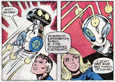 Fantastic fifth wheel: Freakin’ H.E.R.B.I.E. the robot. H.E.R.B.I.E. was created for the 1978 Fantastic Four Saturday morning cartoon. A different company had the adaptation rights to the Human Torch, so H.E.R.B.I.E. was created as the Torch’s TV replacement. (Stories about producers not including the Torch for fear that children might set themselves on fire are not true and have been debunked several times.) These issues even address the fact that there’s an FF cartoon, which also aired in the Marvel Universe. Johnny says he’s not on the show because he wasn’t there the day the contracts were signed.