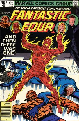 Issue #214: Reed and Sue are on the verge of death, after a Skrull aging ray turned them into old folks. Ben was critically injured in a fight against Terrax. All three are in suspended animation at the Baxter Building, leaving an angst-ridden Johnny all alone. Johnny tries contacting Tony Stark and then the Avengers, but they’re not home. He then flies up to the S.H.I.E.L.D. Helicarrier, where Dum Dum Dugan says Stark is working on converting toxic waste into usable fuel. Back home and alone again, Johnny is contacted by Princess Astra of the Andromeda Galaxy, who the FF met back during the start of this arc. Nova is still fighting the Skrulls out in space, and Astra does not have a cure for Johnny’s teammates.