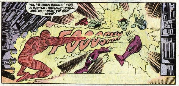 Johnny feels helpless, and then a Skrull attacks. Turns out he snuck into the building some time ago and has been hiding inside since then. He’s another Super Skrull, with the combined powers of the FF. Fighting! Johnny and the Skrull battle out of the building, across the sky, and then down into the NYC sewers. Johnny thinks he’s killed the Skrull, but no — it was just a Skrull robot! He had the aging ray on him, so Johnny takes the ray to Reed. He wakes Reed up in the hopes that Reed can reverse-engineer the ray. At first, it doesn’t appear to work, but then Reed, Johnny, and Ben wake up, feeling stronger and younger than ever. They renew their oath to use their powers for the good of mankind.