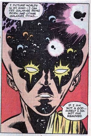 Randolph contacts the FF, telling them he’d been beaten up by the street toughs. Reed rushed to Randolph’s house, to discover that Randolph exposed himself to an “evolution accelerator” to cure his wounds. He’s now been transformed into a tall, golden, godlike being. He uses his new mental powers to turn the street thugs into rats, as Reed looks on in fear.