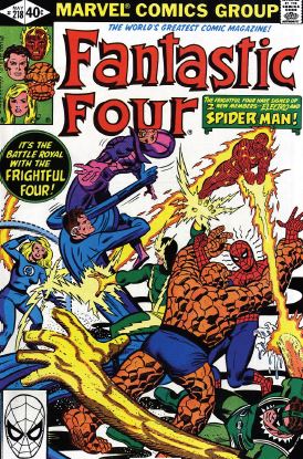 Issue #218: This one begins with Spider-Man climbing up the side of the Baxter Building. But wait… this isn’t Spider-Man! It’s Paste-Pot Pete, um, I mean the Trapster, in disguise as Spider-Man. His teammates in the Frightful Four have taken the real Spidey hostage, and are watching from a distance. We’ve got the Wizard, Sandman, and new member Electro. The Trapster pretends to befriend the Human Torch, only to knock him out. Trapster then fights Ben and defeats him by electrocuting him.