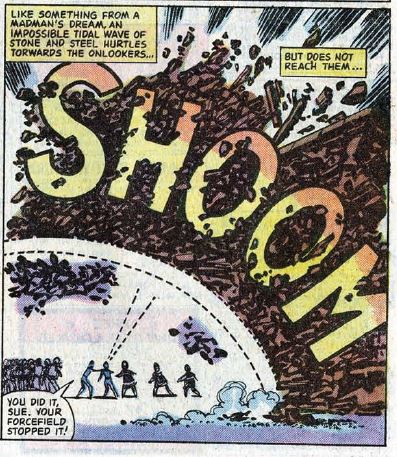 Fade out: Sue’s continues to show her force fields being more powerful than we’d previously seen, using them to clear huge swaths of debris away from citizens in danger.