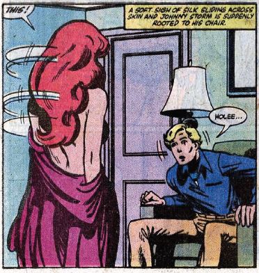 Johnny arrives at Frankie’s apartment, and meets Frankie’s scantily-clad roommate, Julie Angel. Julie, an aspiring actress, leaves the two of them alone. Then Frankie greets Johnny. She’s still in her bathrobe, and in tears. She says she has to show Johnny something, but she’s afraid he’ll think she’s crazy. Johnny promises to help, so she shows him her secret by… peeling off her bathrobe right in front of him! (Wha-hey!) We don’t see what Johnny sees, but the caption tells us, “He knows!”